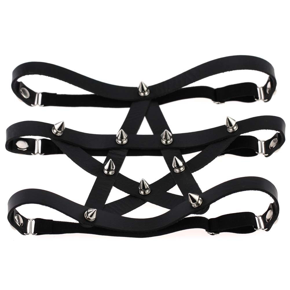A statement of elegant restraint. This adjustable pentagram harness frames the thigh with clean, architectural lines and glossy hardware—perfect for refined play, club looks, or layering over lingerie.